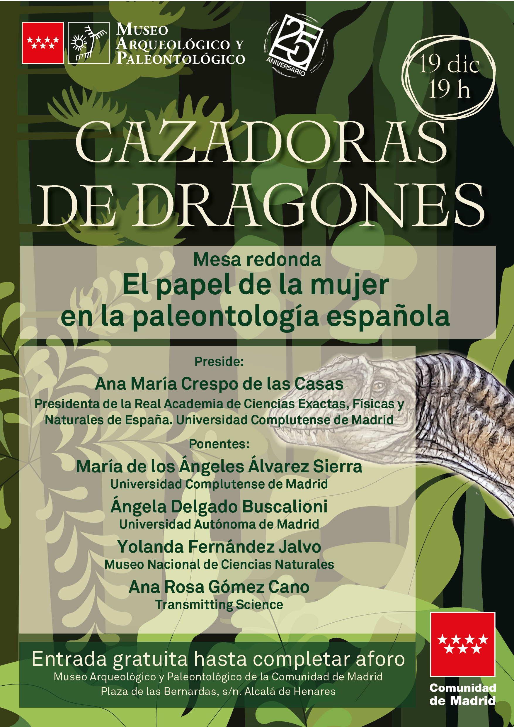 El Museo Arqueológico y Paleontológico de la Comunidad de Madrid organizó el pasado 19 de diciembre a las 19 horas una mesa redonda bajo el título de Cazadoras de dragones: el papel de la mujer en la paleontología española, que contó con la participación de algunas de las paleontólogas más relevantes de nuestro país. Al hilo de la exposición Cazadores de Dragones, que se exhibió hasta el 12 de enero de 2025, este coloquio abordó la existencia de proyectos españoles de investigación sobre dinosaurios con participación de científicas del máximo nivel y el mundo de la paleontología en general.