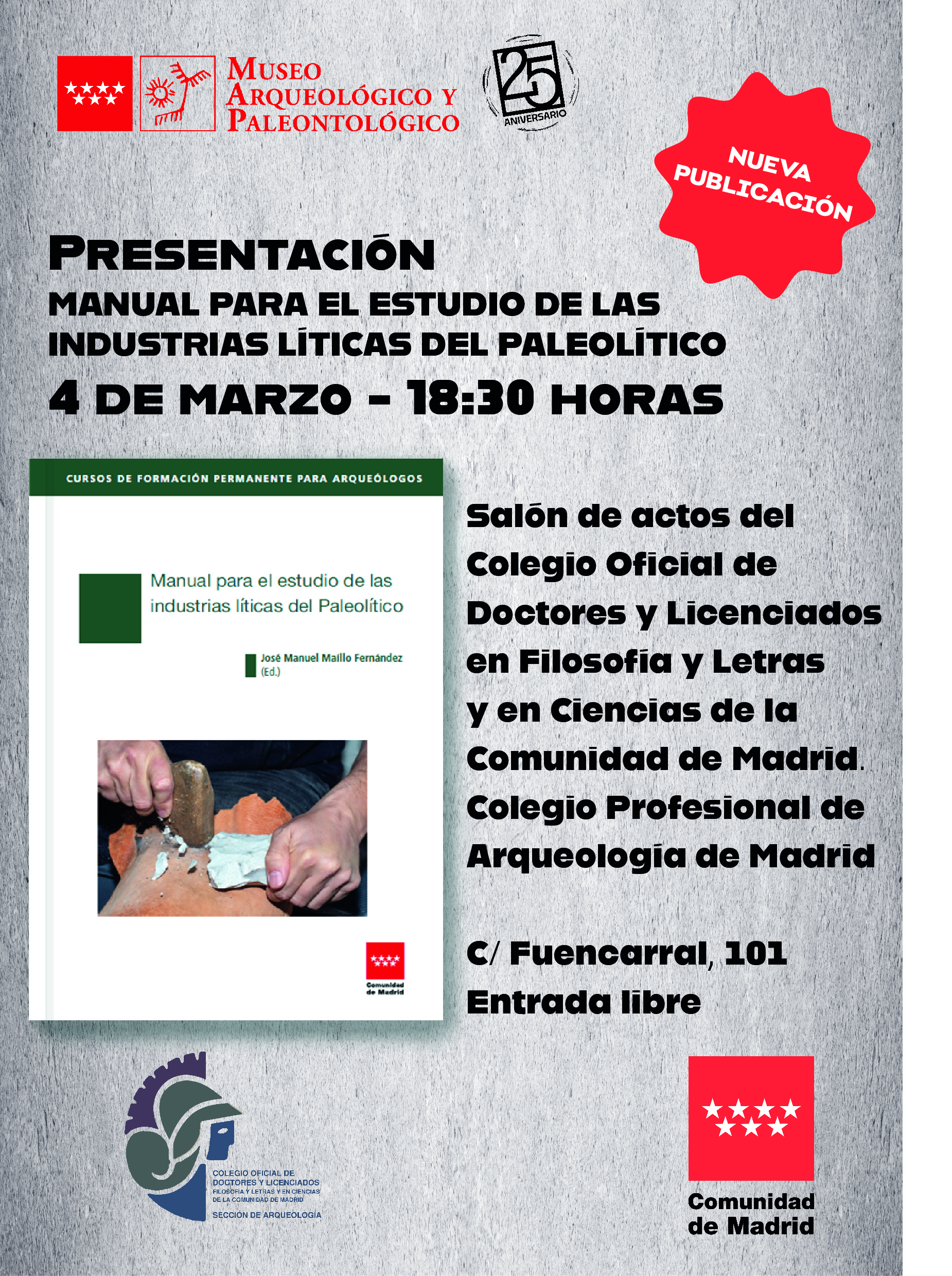 El Museo Arqueológico y Paleontológico de la Comunidad de Madrid y el Colegio Profesional de Arqueología - Colegio de Doctores y Licenciados en Filosofía y Letras y en Ciencias de la Comunidad de Madrid presentaron su nueva publicación Manual para el estudio de las industrias líticas del Paleolítico, manteniendo su trayectoria de colaboración en el desarrollo de actividades en beneficio de los profesionales y estudiantes de la arqueología madrileña.
